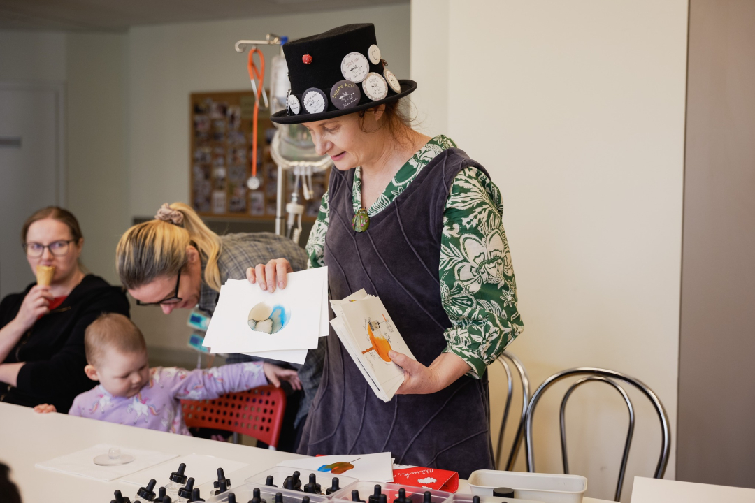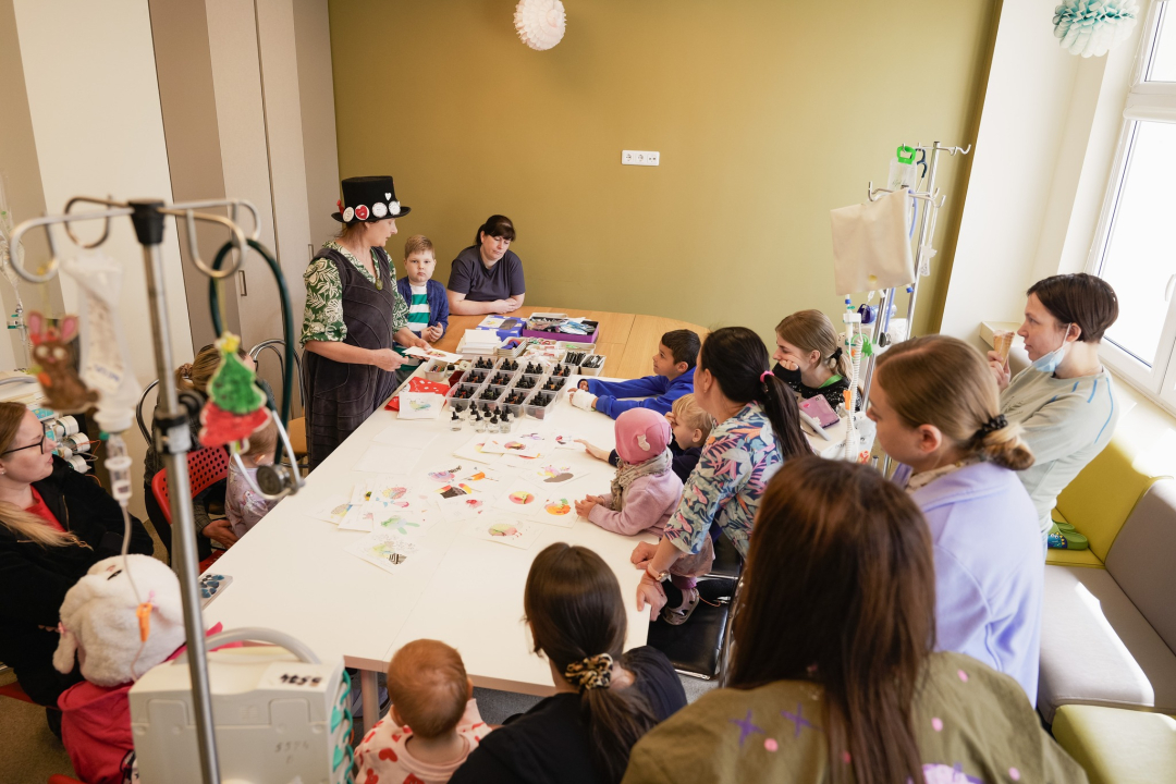 Mūsų herojus aplankė dailininkė, iliustratorė Sigutė Ach. Galerija Vaikučius ir jų tėvus dailininkė pakvietė į užsiėmimą, kuri įtraukė savo unikalumu – kūrėme personažus ir gražiausius piešinius iš… dažų dėmių! Kiekvienas herojus išsirinko gražiausias tris spalvas, o dažų lašiukus prispaudė stikliniu dangteliu. Šis būdas leido visų piešiniams virsti išskirtiniais – nė vieno nebuvo vienodo! Ant spalvingiausių dėmių piešėme smulkias detales, kūrėme pavadinimus ir po truputį gimė personažai.Sakome nuoširdų ačiū Sigutei Ach, kuri skyrė laiko praskaidrinti sergančių mažylių dieną ir pripildyti ją spalvomis. Esame dėkingi, kad atvėrėte vaikams duris į stebuklingą meno, pažinimo, smalsumo ir mažų stebuklų pasaulį. Tikime, kad nuo šiol kiekviena knygoje sutikta Jūsų iliustracija, ant puodelio pamatyta sparnuota karvutė ar du debesis pučiantys zuikiai, pamatyti atviruke, dar labiau šildys. Juk būsime jau sėdėję prie bendro kūrybos stalo, dalinęsi spalvomis ir istorijomis, šiluma ir šypsenomis. Siunčiame linkėjimus mūsų fondo bendruomenės nariams Angolo Italiano Kaunas , kurie pasirūpino saldžiomis akimirkos. Po spalvingos popietės vaikai ir jų tėveliai turėjo galimybę vaišintis skaniausiais gelato. Dėkojame Jums už palaikymą ir gražią draugystę.