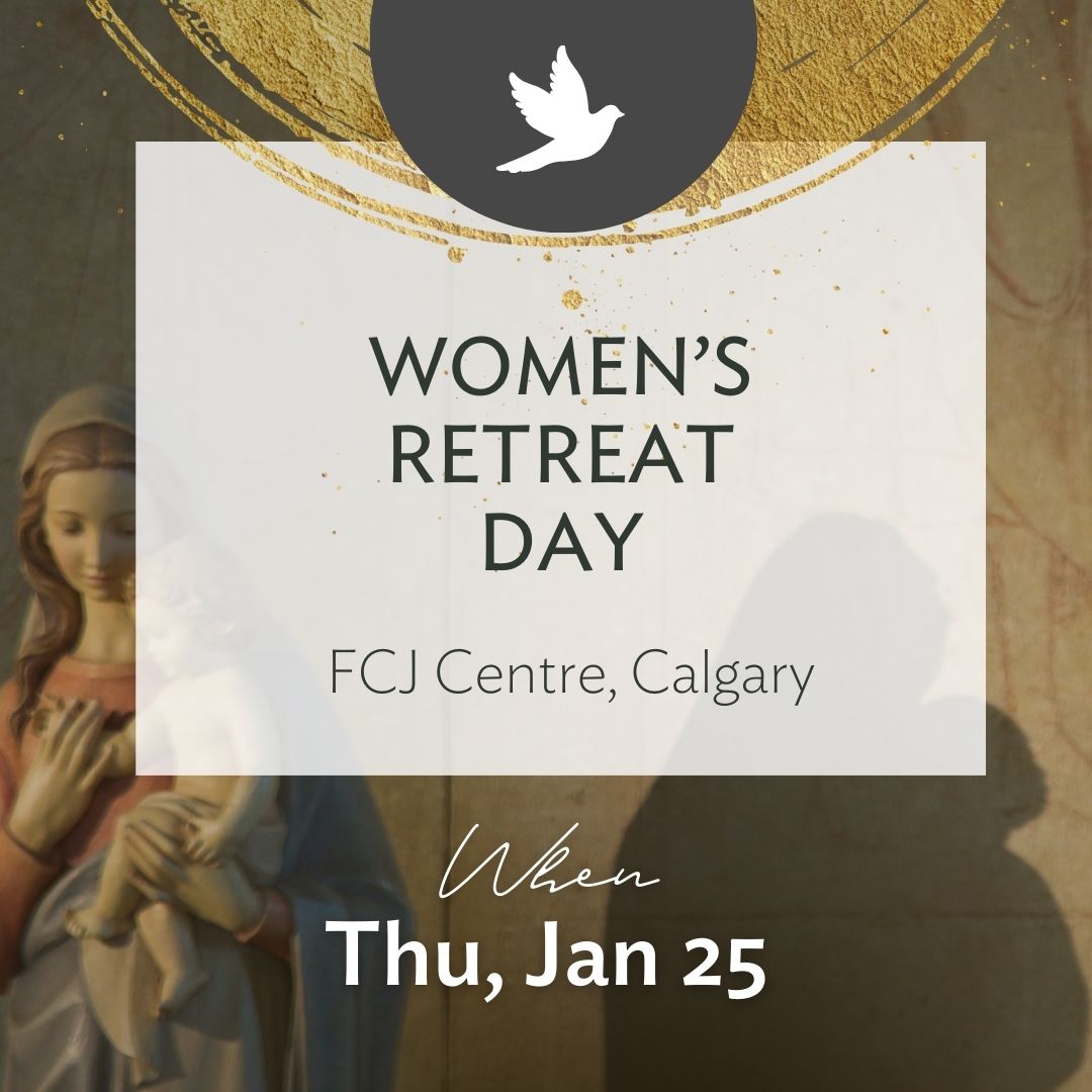 Thu, Jan 25 from 9:30 am to 2:30 pm - FCJ Centre, Calgary | Join Sr. Ann Marie Walsh and Patricia Harasym for a Women's Retreat Day inspired by Mary, a woman of deep faith, who faced challenges like any other woman. The day will include spiritual refreshment, snacks, and lunch. Info & Registration