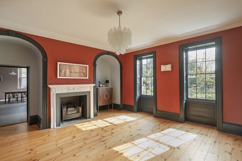 The sitting room is exquisite; with a stripped wooden floor and beautiful natural light flooding in from the oversize triple sash bay-window overlooking the gorgeous gardens and pool beyond. A cast-iron wood burning stove provides additional warmth in the winter whilst the attractive marble surround a focal point for the room.