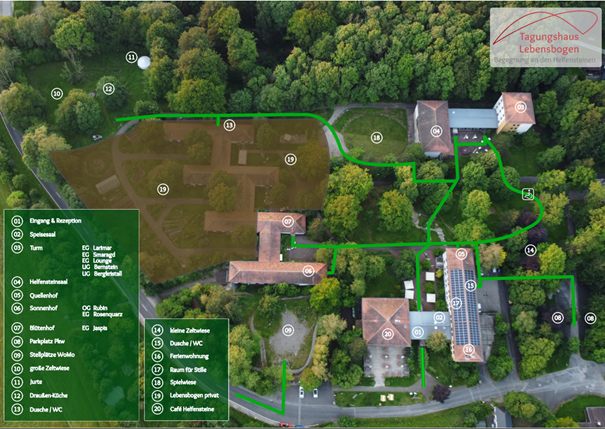 Das Tagungshaus Lebensbogen bietet Raum für etwa 120 Menschen, mit unterschiedlichen Zimmerkategorien oder Zeltplatz/Wohnmobilstellplatz.