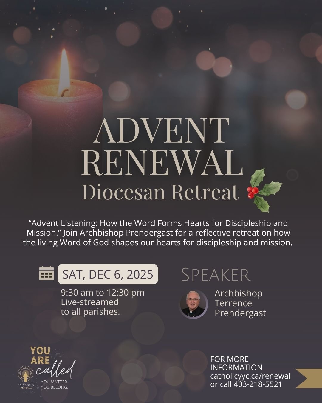 Sat, Dec 6, 2025 (in your parish) with Archbishop Terrence Prendergast (livestream) on "Advent Listening: How the Word Forms Hearts for Discipleship and Mission." More