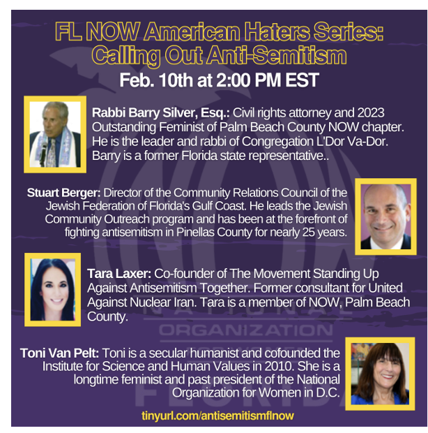 FL NOW is countering this with a webinar series called The American Haters Series. The first webinar addresses antisemitism.