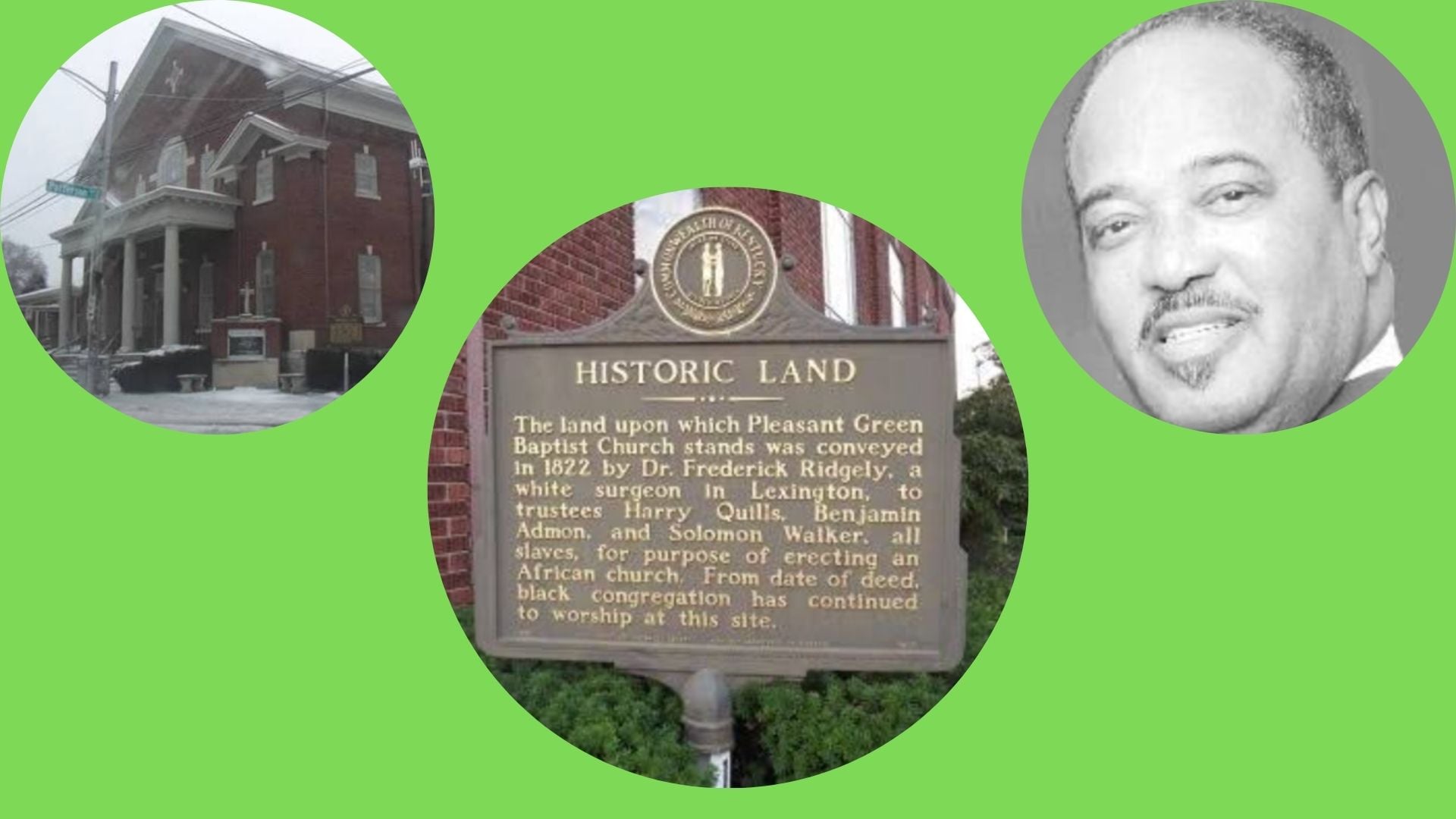 “The land upon which Pleasant Green Baptist Church stands was conveyed in 1822 by Dr. Frederick Ridgely, a white surgeon in Lexington, to trustees Harry Quills, Benjamin Admon, and Solomon Walker, all slaves, for purpose of erecting an African church. From date of deed, black congregation has continued to worship at this site.”