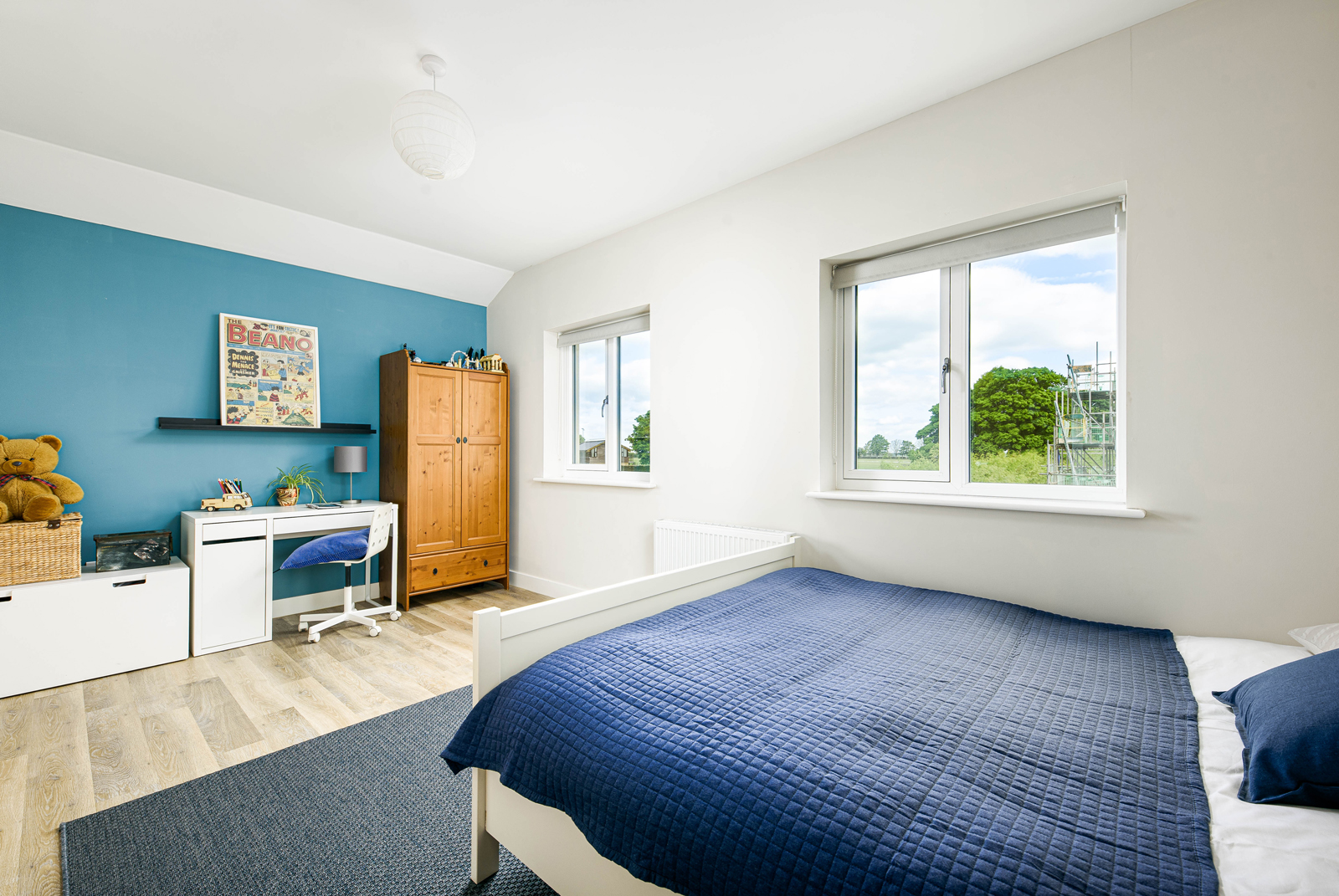 There are four good size bedrooms and the principal bedroom has French doors leading onto a balcony with superb views. To the rear, views overlook the playing fields and beyond. This particular house also has the benefit of a large, double width driveway, with parking for four cars and double garage.