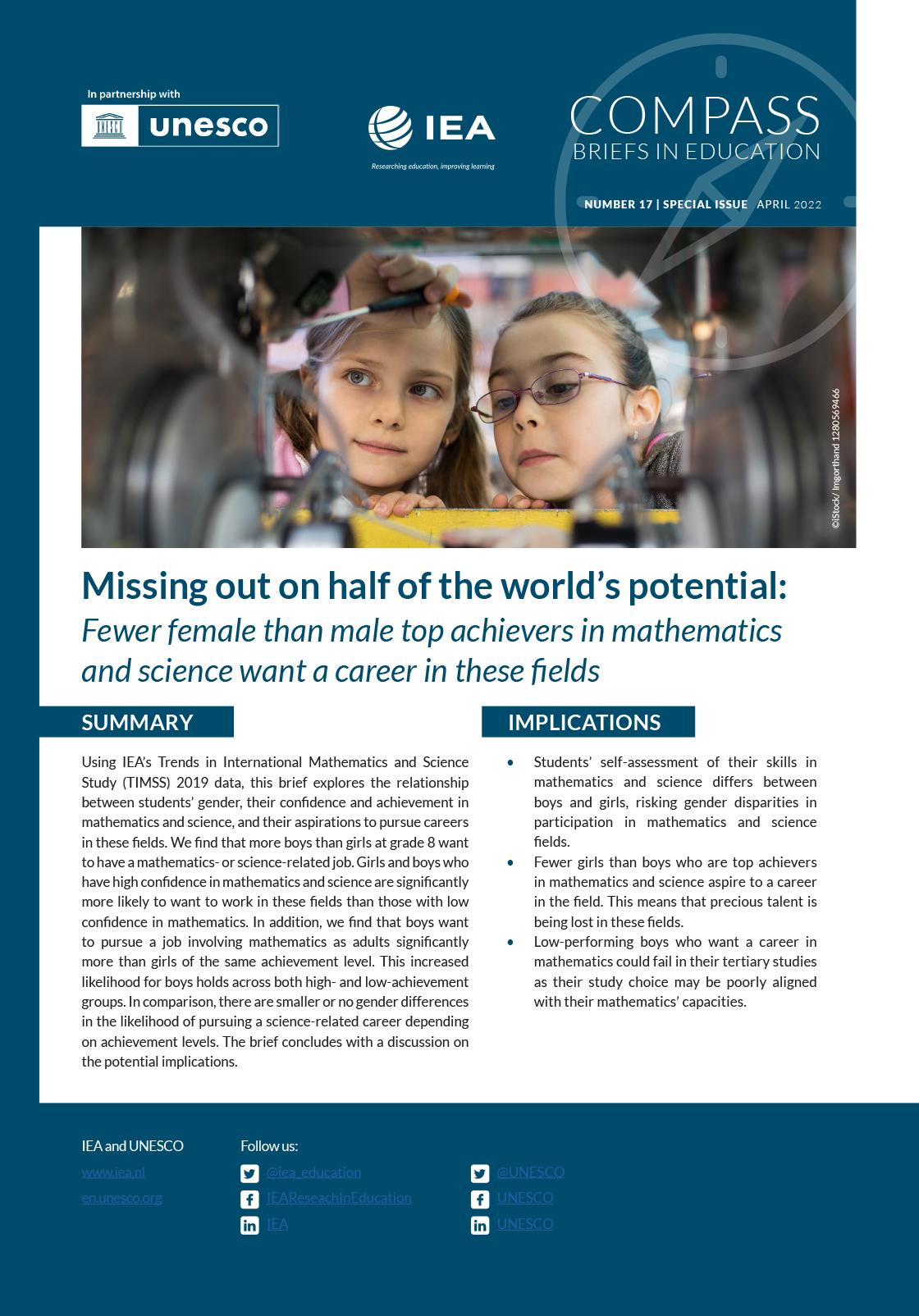 Using IEA’s Trends in International Mathematics and Science Study (TIMSS) 2019 data, this special brief in collaboration with UNESCO explores the relationship between students’ gender, their confidence and achievement in mathematics and science, and their aspirations to pursue careers in these fields.