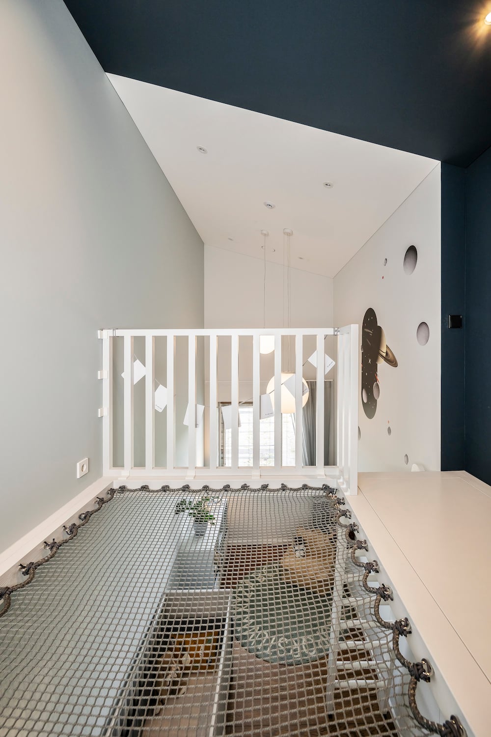 Apgalvotai suplanuotoje erdvėje yra tėvų kambarys su drabužine, du vaikų kambariai, elegantiška virtuvė ir svetainė, ramus namų biuras ir du vonios kambariai. Natūrali šviesa išryškina uosio lukštu dengtus medinius paviršius ir skalūno plyteles, kurioms gražiai kontrastuoja šviesūs baldai ir strategiškai parinkti apšvietimo sprendimai.
