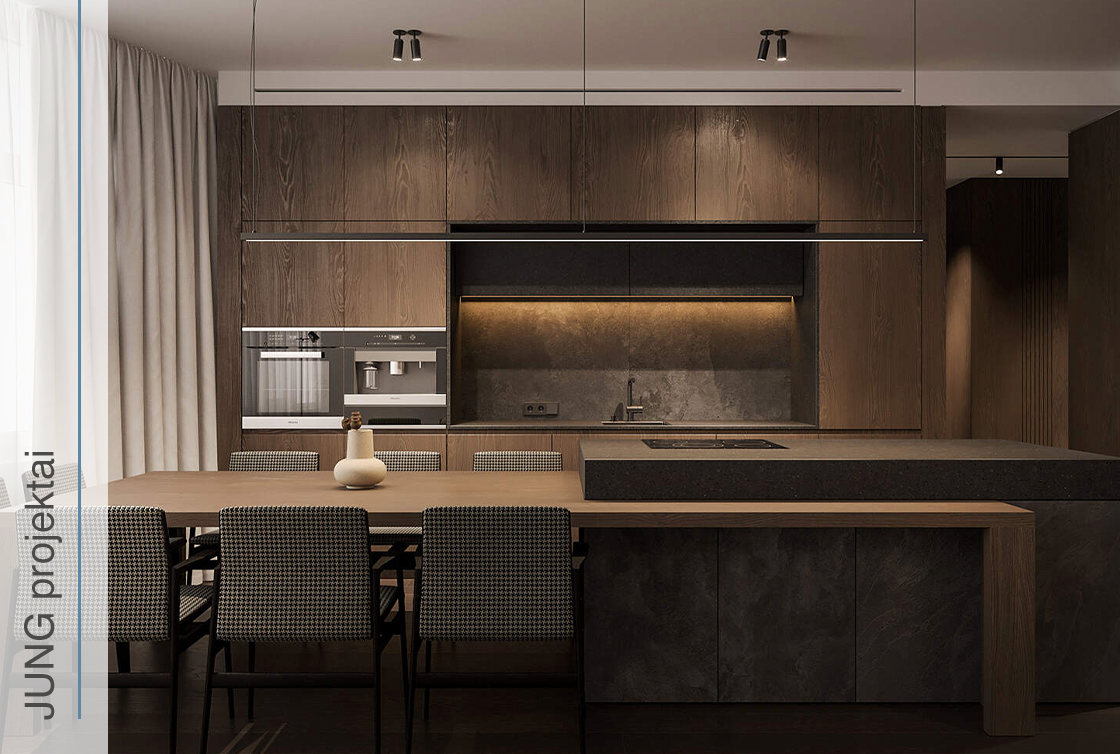 Švarias linijas paryškina tamsių tonų JUNG LS 990 jungikliai, pabrėžiantys minimalistinę, modernią estetiką ir subtilią eleganciją.