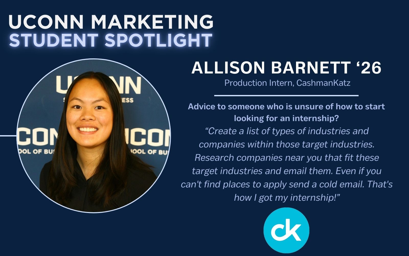 The best way to find an internship? “Create a list of types of industries and companies within those target industries. Research companies near you that fit these target industries and email them. Even if you can't find places to apply send a cold email. That's how I got my internship! I recommend advertisement agencies if you are unsure of a specific area of interest, they have everything,” Allison shared. A great place to start is the Marketing Internship and Job Posting List. It’s so important to put yourself out there, as Allison did. She reiterates the importance of having an internship as “It gives real world experience in a professional and personal level that you can't learn in a classroom.” The skills and hands-on collaborative experience that Allison had this summer is sure to take her far, on campus and beyond.
