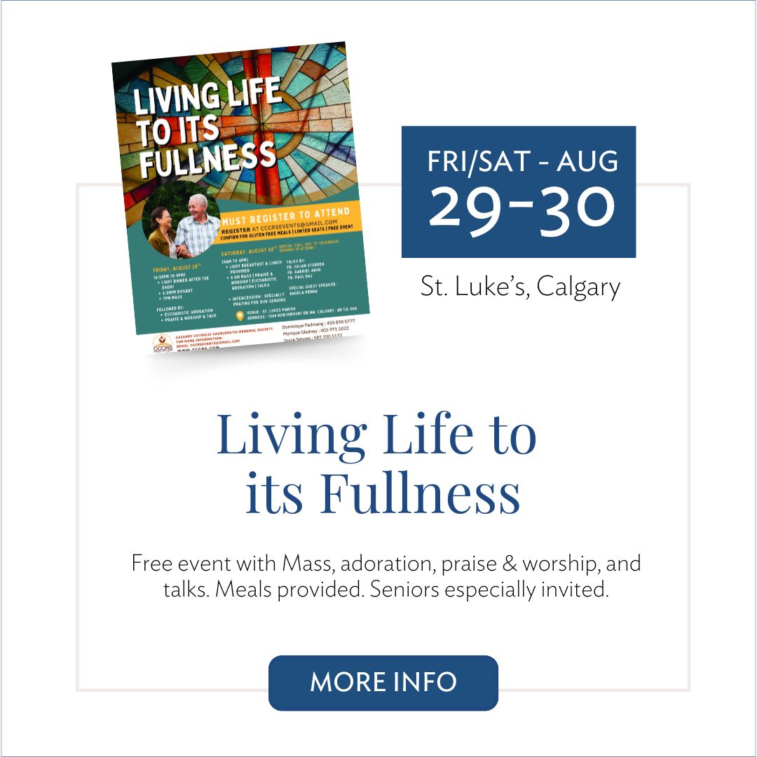 Fri, Aug 29 & Sat, Aug 30 at St. Luke’s, Calgary | Free event with Mass, adoration, praise & worship, and talks. Meals provided. Special invitation to seniors. More