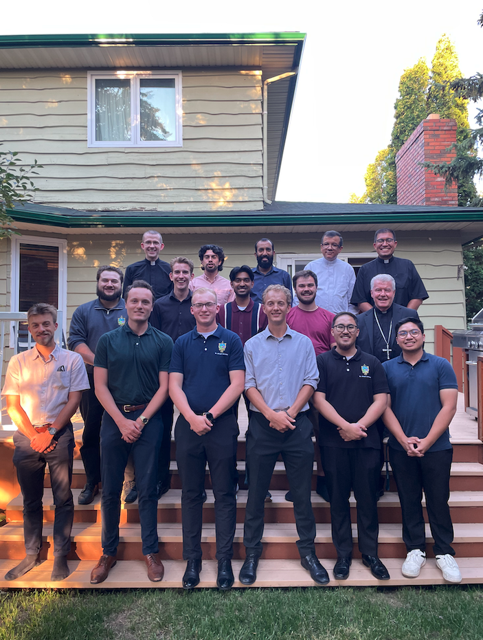 | Our seminarians gathered with Bishop McGrattan at St. Peter’s Rectory for the annual summer BBQ before the new formation year begins. |