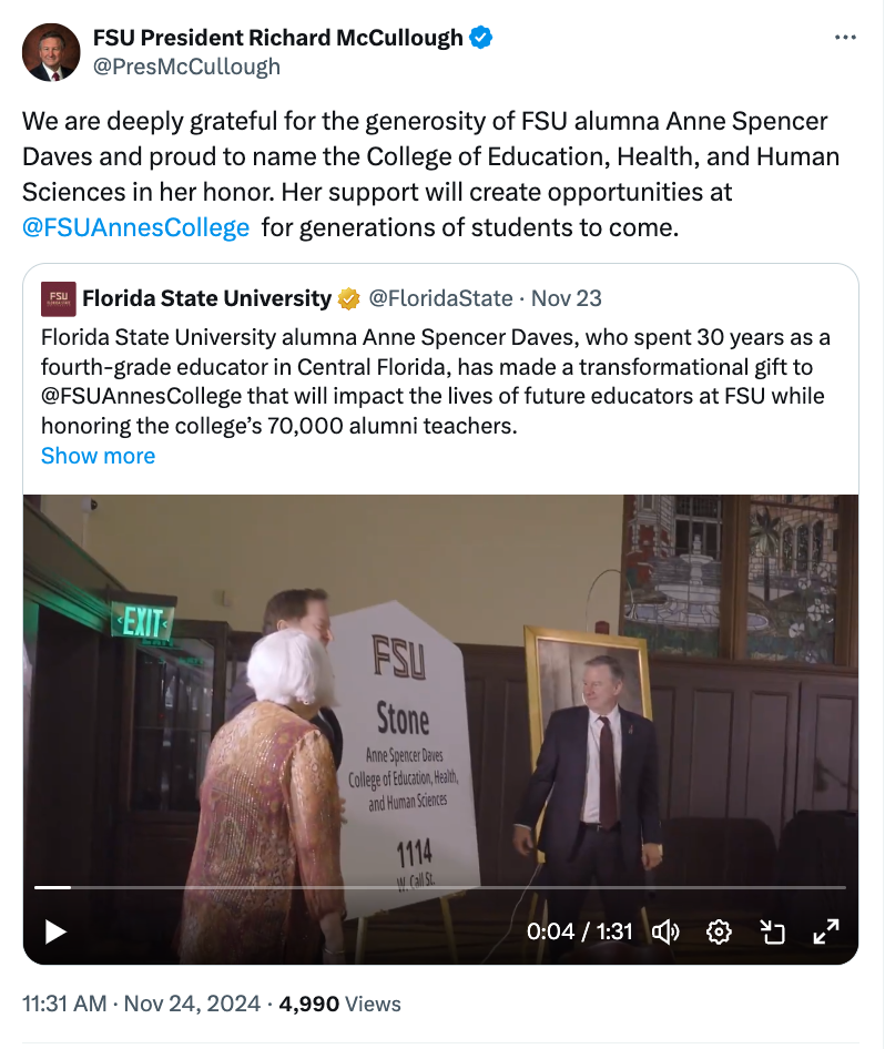 Florida State University alumna Anne Spencer Daves, who spent 30 years as a fourth-grade educator in Central Florida, has made a transformational gift to the university that will impact the lives of future educators at FSU while honoring alumni teachers. During a special Friday dinner at the Heritage Museum, President Richard McCullough dedicated the Anne Spencer Daves College of Education, Health, and Human Sciences — the first FSU college named after an alumna. It will now be known as Anne’s College. Read more ...