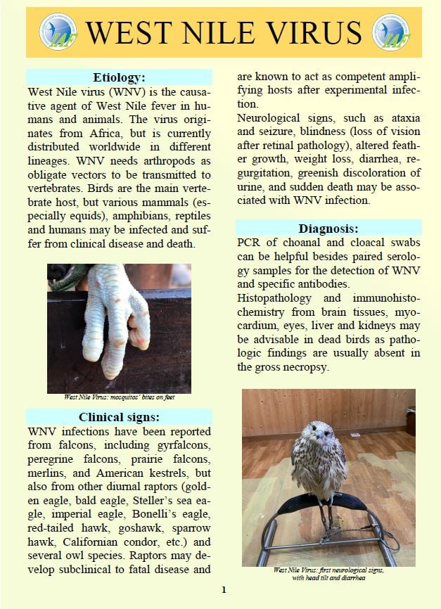 The IAF Welfare Working Group hereby releases the third instalment of its series of concise and clear information on common diseases that affect the birds of prey used in falconry. Eventually, it is hoped to bind them into a booklet and to promote them on our website and social media, as a reference for falconers and for those vets who may not be familiar with avian diseases, but may come across them; in many countries there are no avian veterinary specialists and these should encourage them to look deeper. The third in the series, “West Nile Virus”, has been prepared by Andrea Villa and Dr. Dominik Fischer, DipECZM (WPH), University of Giessen, with input from the rest of the IAF Ethics and Welfare Working Group.
