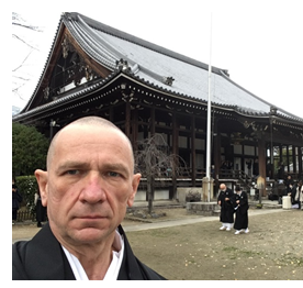 Our training begins with the trip to Hieizan, the stronghold of Tendai school for fifteen centuries, where Shinran Shonin started as a monk. We walk through the chambers of Shoren-in where he was ordained. We step inside the Jogyo Zanmai-do and walk around the statue of Amida Buddha where Shinran Shonin walked thousands of times. We touch the bamboo rail that his hand touched during the ninety-day walking meditation, the rail polished by thousands of hands of monks who circumambulated the statue over centuries.