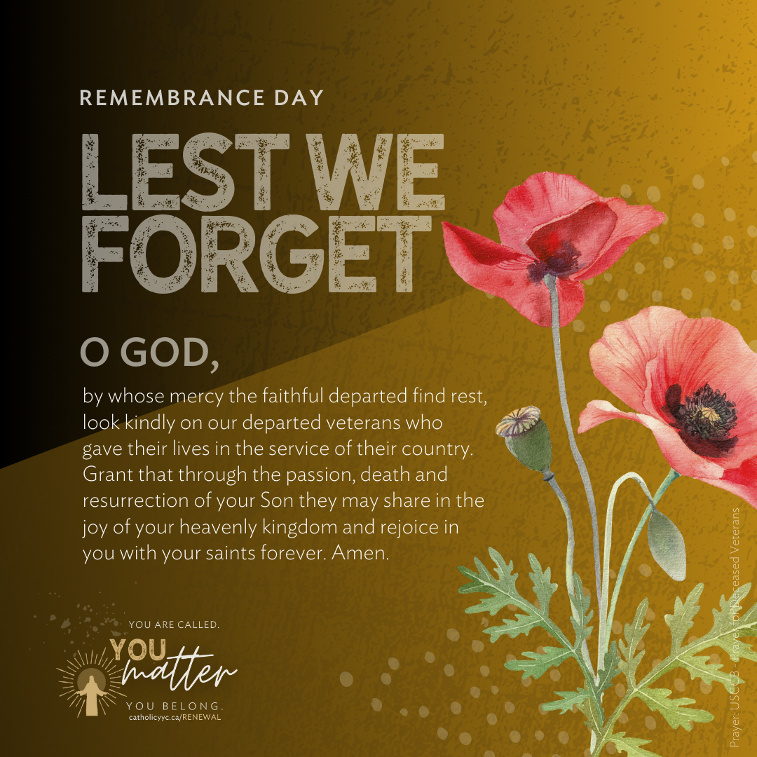 Canadians pause in silence on November 11 to remember those who died from war and to pray for the victims of aggression and inhumanity throughout the world. This is a day to pray for peace, to consider what we are doing as individuals, as a community, and as a nation to bring God's peace into the world.