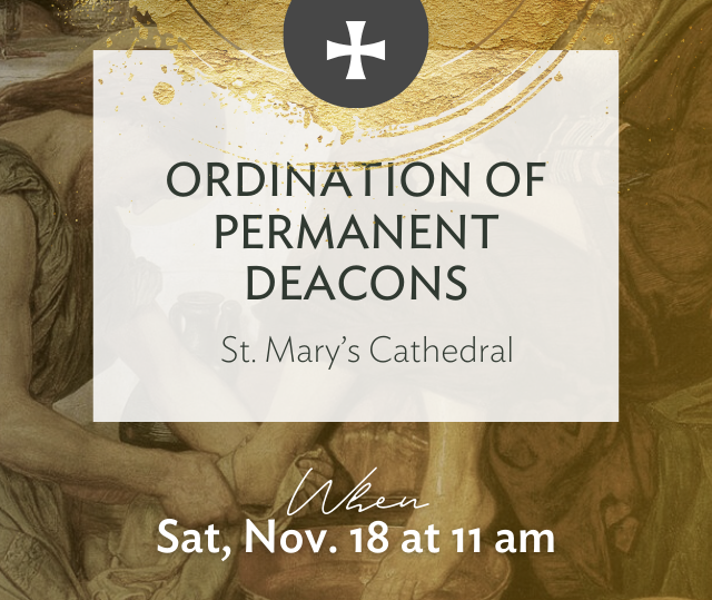 Sat, Nov. 18 at 11 am, St. Mary's Cathedral | You are invited to the upcoming ordination of 12 permanent deacons in our Diocese! Doors will be opened at 10 am. Mass will be live-streamed at youtube.ca/calgarydiocese