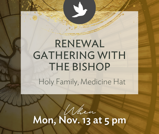 Monday, Nov. 13 from 5 pm to 9 pm, Holy Family Parish, Medicine Hat | Bishop McGrattan will be gathering with us in Medicine Hat this Monday: 5 pm Mass | 6 pm Dinner | 7 pm Session. Registration is required to help in planning the dinner.