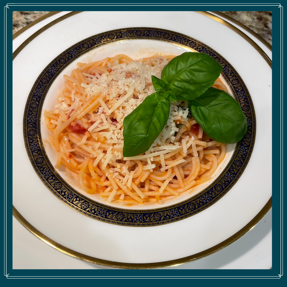 Add the reserved tomato liquid to the saucepan and stir. Toss in the basil sprigs and reduce the heat to simmer. Cook approximately 8–10 minutes to thicken the sauce.