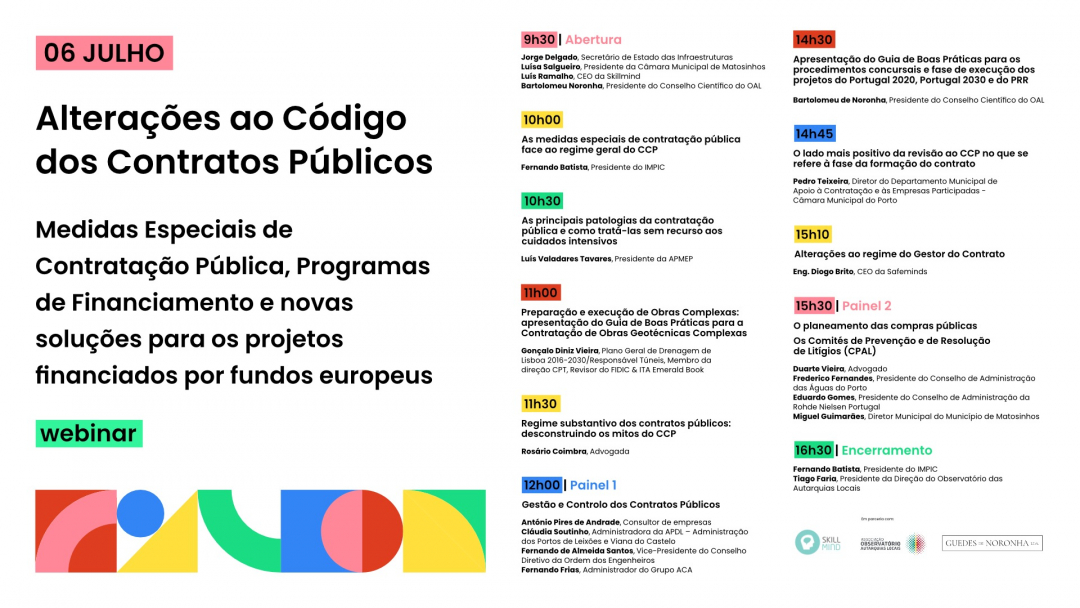 Alterações ao Código dos Contratos Públicos, Medidas Especiais de Contratação Pública, Programas de Financiamento e novas soluções para os projectos financiados por fundos europeus". 6 de Julho a partir das 9h30, inscrições gratuitas no link em baixo.