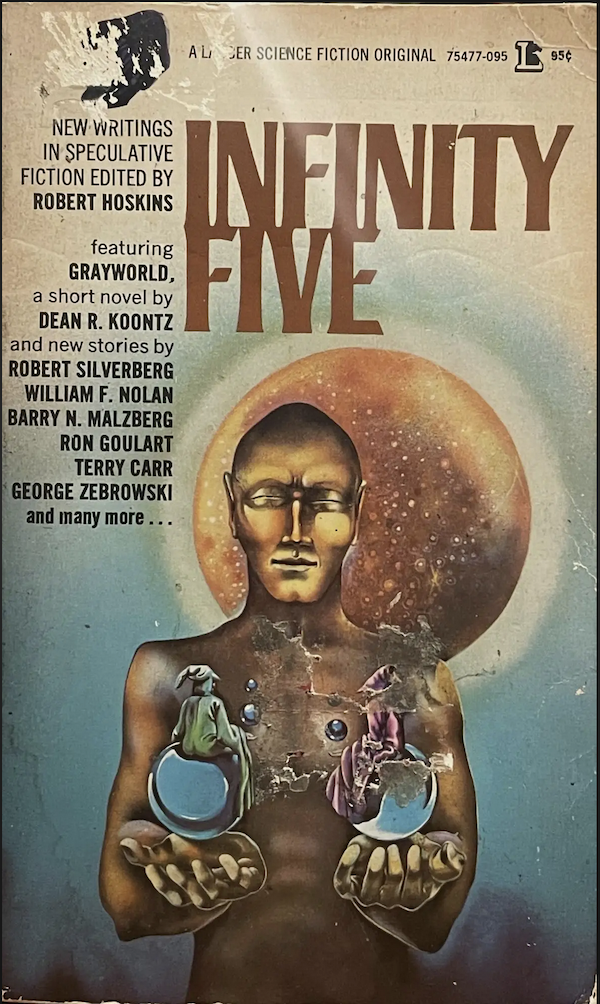 . . . selling my first short story, “Nostalgia Tripping” (a Malzberg pastiche) to editor Robert Hoskins for his original anthology INFINITY FIVE—and it was published in 1973, when I was nineteen years old.