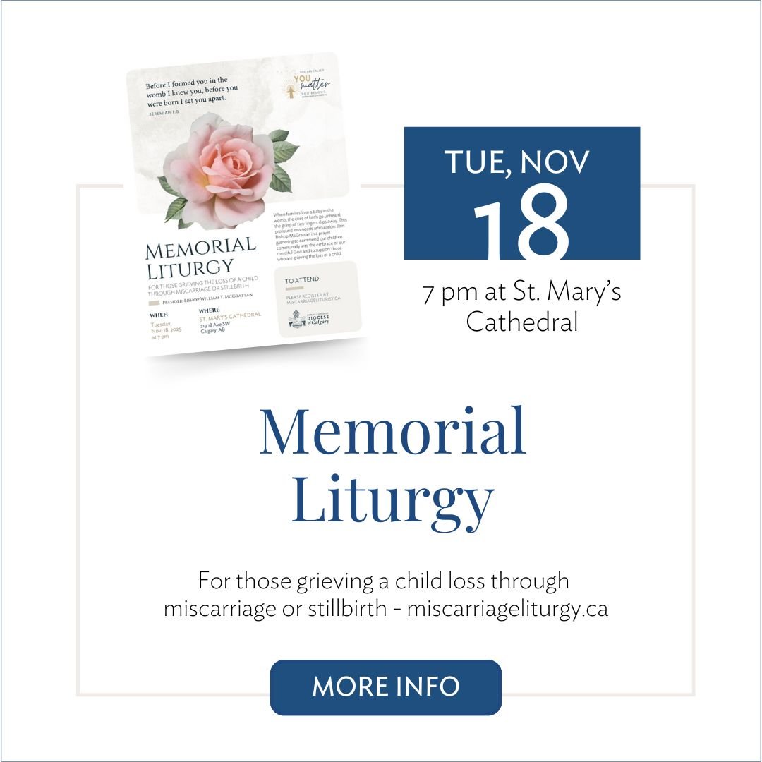 Tue, Nov 18, at 7 pm at St. Mary’s Cathedral, Calgary – Join Bishop McGrattan in prayer for families grieving the loss of a child through miscarriage or stillbirth. Register at miscarriageliturgy.ca