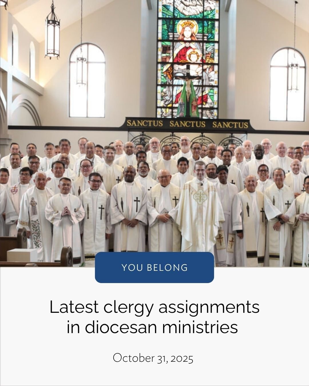 Bishop McGrattan has announced clergy changes for the Diocese, welcoming Rev. Andrew Obinyan, appointing new pastors, and thanking Deacons Luis Hong and Vivian Pinto as they retire from active ministry. Read announcement