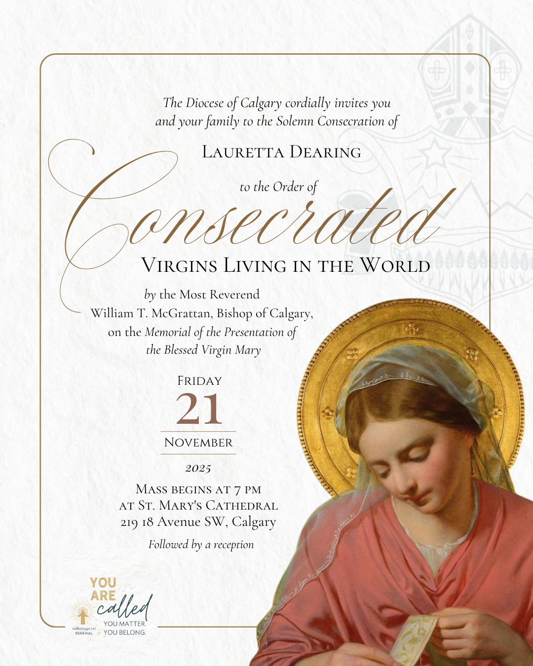 Join Bishop McGrattan for the Mass of Solemn Consecration of Lauretta Dearing to the Order of Consecrated Virgins Living in the World, a vocation of women who dedicate their lives wholly to Christ through prayer and service. When: Friday, Nov 21, 2025, at 7 pm, St. Mary’s Cathedral - followed by a reception. All are welcome.