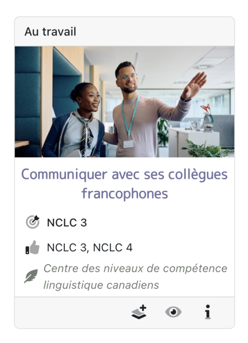 Toutes les unités d’apprentissage en ligne du Didacticiel national du curriculum CLIC (développées par le Centre des niveaux de compétences linguistiques canadiens - CNCLC) sont maintenant offertes dans le Catalogue d’unités d’Avenue! Douze unités sont déjà disponibles pour les NCLC 3, 4 et 5.