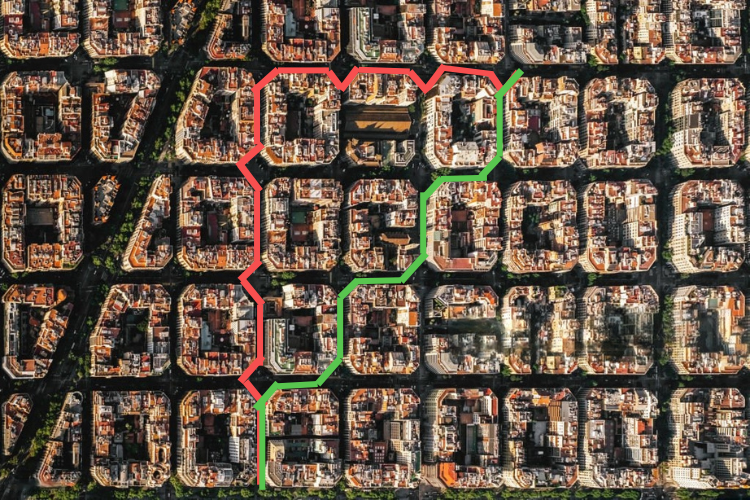 In Barcelona gebruiken veel voetgangers de zogenoemde ‘Escaleta’-methode (traptreden - methode) om tijd te besparen. In plaats van rechtdoor te lopen, wisselen ze slim van richting, alsof ze een trap oplopen. Zo voorkomen ze onnodige stops bij rode verkeerslichten. Daarnaast wordt de route efficiënter, omdat de huizenblokken van Eixample niet precies vierkant zijn. Deze techniek is zelfs wiskundig onderbouwd en staat bekend als de ‘geometría del taxista’ of ‘Manhattan-afstand’. Probeer het zelf eens uit en ontdek hoe je je sneller door Eixample beweegt.