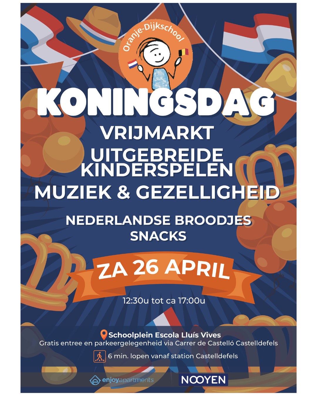 Op zaterdag 26 april 2025 is het weer tijd om Koningsdag te vieren. Om de verjaardag van de koning ook in Spanje niet onopgemerkt aan ons voorbij te laten gaan, wordt er op deze dag speciaal een Koningsdag Familiefeest georganiseerd bij de Nederlandse Oranje-Dijkschool in Castelldefels. De hele middag zijn er activiteiten voor jong en oud, zoals een vrijmarkt, kinderspelen, eten en drinken en Nederlandstalige muziek!