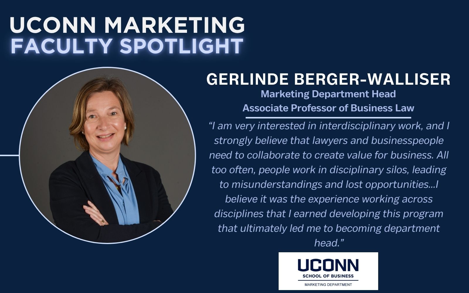 We are excited to welcome Professor Gerlinde Berger-Walliser as the new head of the UConn Marketing department. Since joining UConn in 2012 as a Professor of Business Law, she has helped to launch many interdisciplinary initiatives. Among them is the EUROBIZ Program, a dual degree in business and German studies which was cofounded with CLAS. She also helped establish the Social Responsibility & Impact in Business marketing concentration, minor and Master’s program (MSSRIB). Her interest in interdisciplinary work stems from her own experience as an undergraduate where she hesitated between business and law, as well as her research on law and strategy. “All too often, people work in disciplinary silos, leading to misunderstandings and lost opportunities...I believe it was the experience working across disciplines that I earned developing the MSSRIB program that ultimately led me to becoming department head,” Professor Berger-Walliser shared. Prior to joining UConn, she lived and worked abroad in France, specializing in international law.
