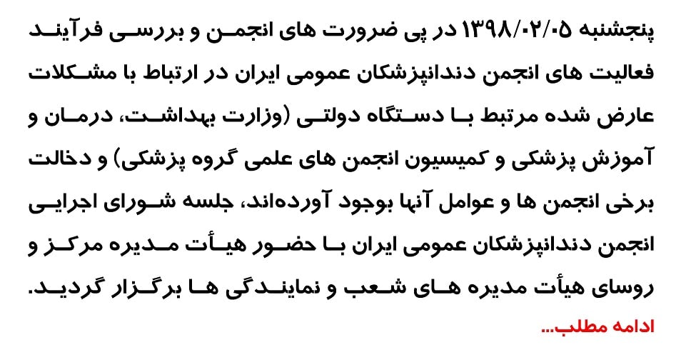 شعبه بروجرد انجمن دندانپزشکان عمومی ایران در پی فراخوان انجمن و همت عالی مجموعه فعال و زحمتکش همکاران دندانپزشک در بروجرد، اقدام به جمع آوری کمک نقدی کردند که بصورت کارت هدیه یکصد هزار تومانی بین مردم منطقه سیل زده توزیع کردند و خدمات دندانپزشکی نیز در مراکز موجود به نیازمندان ارائه کردند. این اقدامات همچنان ادامه خواهد یافت و اراده همکاران بر این استوار است که، برای کاهش آسیب مردم میهن مان به این وظایف میهنی و خدمات دندانپزشکی ادامه دهند. از آقای دکتر محمد محمدی رییس هیات مدیره انجمن دندانپزشکان عمومی ایران شعبه بروجرد و اعضای هیات مدیره و همکاران داوطلب دندانپزشک سپاس و تقدیر خود را اعلام می داریم. امیدواریم همه بتوانیم در این سیل ویرانگر با تمام توان در خدمت مردم باشیم.
