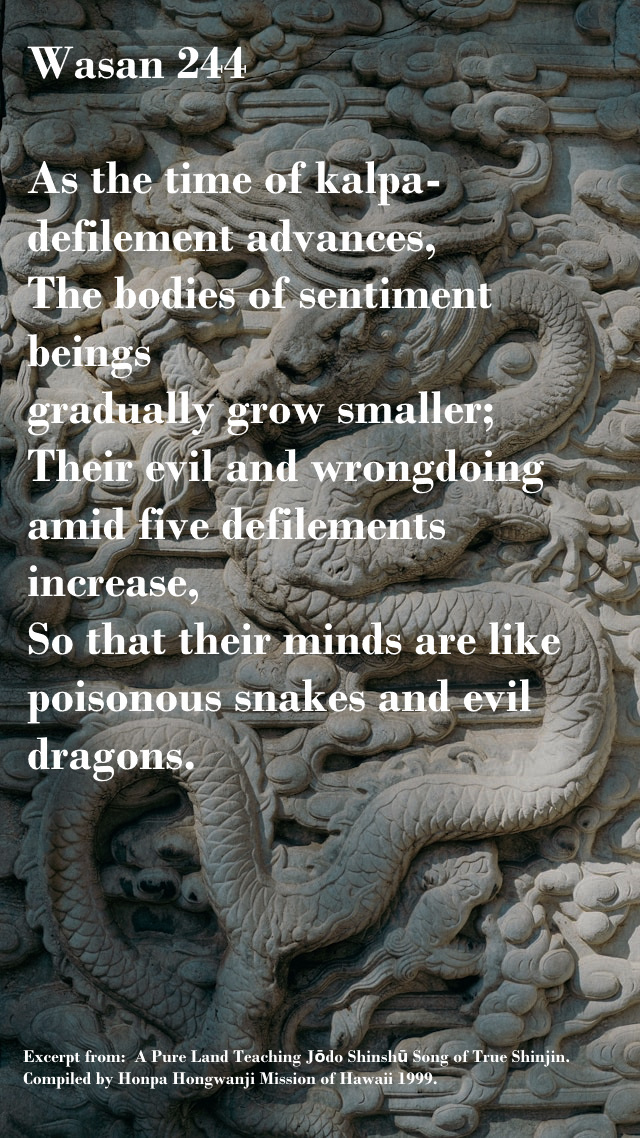 Well, no, that’s not what the Pure Land means in our tradition. One cannot take comfort in a cold, bloodless symbol that refers to nothing but the amelioration of the planet’s endemic disorders; rather, the masters of our tradition insist that Jōdo represents a ubiquitous spiritual reality. This is not to deny that Shinran wished (as we all should) to see peace prevail in the world by spreading the Buddha’s teaching. But he, most assuredly, did not believe that this ‘burning house’ could ever be transfigured into an ever-lasting arena of bliss, given the sorry state of our ruptured humanity which the Larger Sutra strikingly portrays as follows:
