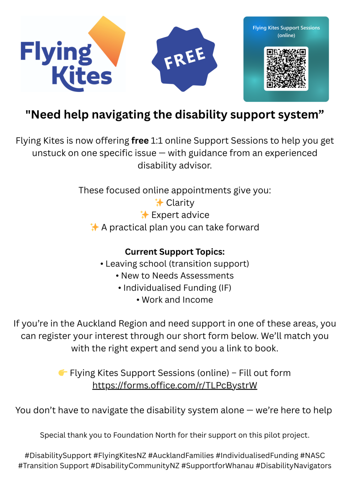 Feeling stuck navigating disability support in Aotearoa? Flying Kites is offering free 1:1 online support sessions to help you work through one specific issue and create a clear plan forward.
