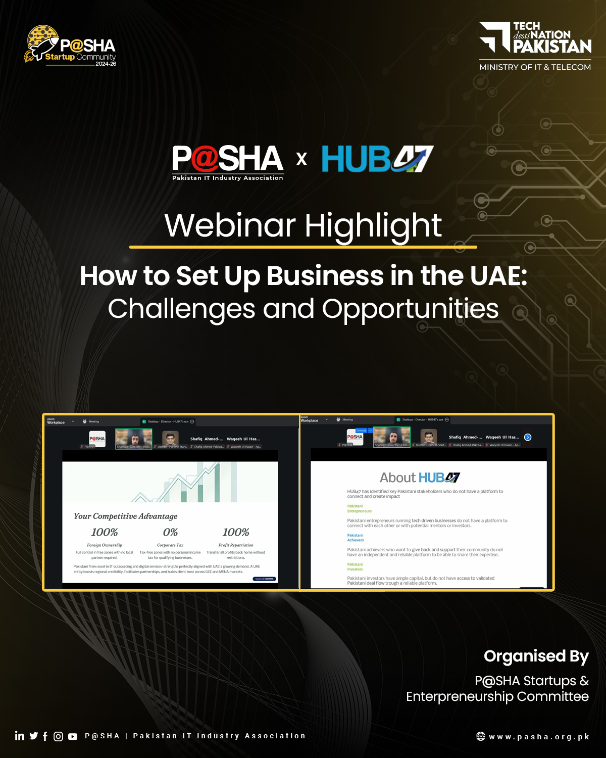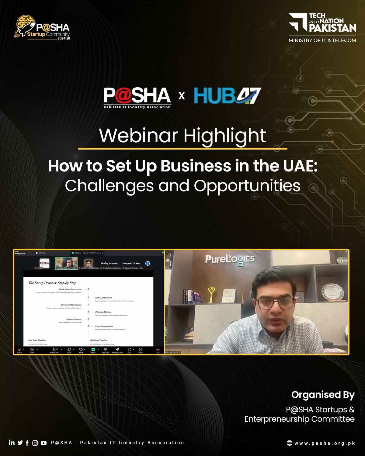 P@SHA’s Startups and Entrepreneurship Committee hosted a webinar on “How to Set Up Business in the UAE: Challenges and Opportunities,” led by Muhammad Shahbaz Khan, Director at HUB47 – Startups Incubator, and chaired by Usman Akbar. The session covered business setup requirements, market entry challenges, and growth opportunities for Pakistani companies looking to expand to the UAE, providing practical insights to support international business ventures.