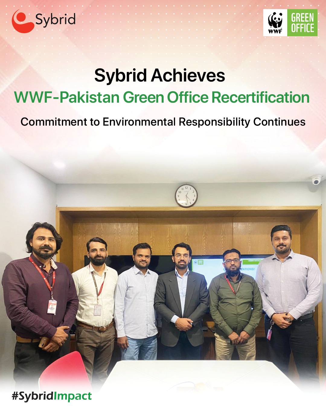 Sybrid’s Karachi office has been re-certified under the WWF-Pakistan Green Office Program, reflecting ongoing progress in workplace sustainability. The recertification follows a detailed audit evaluating energy conservation, resource efficiency, and environmental practices.