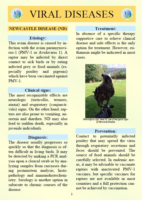 The IAF Welfare Working Group hereby releases the seventh instalment of its series of concise and clear information on common diseases that affect the birds of prey used in falconry. Eventually, it is hoped to bind them into a booklet and to promote them on our website and social media, as a reference for falconers and for those vets who may not be familiar with avian diseases, but may come across them; in many countries there are no avian veterinary specialists and these should encourage them to look deeper. The seventh in the series, “Viral diseases”, has been prepared by Dr. Andrea Villa and Dr. Dominik Fischer, DipECZM (WPH), University of Giessen, with input from the rest of the IAF Ethics and Welfare Working Group.
