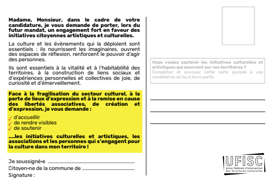 Des cartes postales, à télécharger, à imprimer et à faire signer parmi les électeur·ices que vous croiserez : public, badauds, voisin·es, curieux·ses, famille, ami·es, commerçant·es, élu·es, candidat·es, etc.