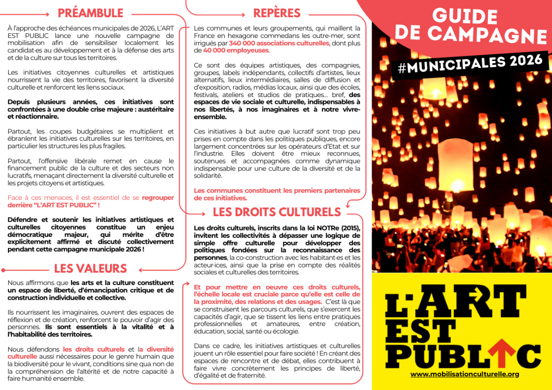 Le guide de campagne L'ART EST PUBLIC propose des repères et des idées d'action pour sensibiliser les candidat·es. Un dépliant facile à imprimer et à partager partout !