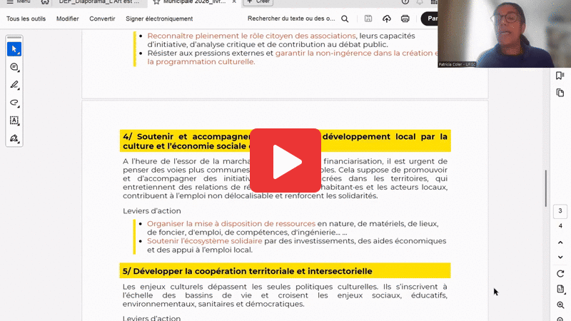 Ce livret 4 pages permet de partager des repères clairs, accessibles et argumentés, à partir desquels ouvrir le dialogue avec les candidat·es, nourrir le débat public et rendre visibles les enjeux souvent invisibilisés des politiques culturelles locales.