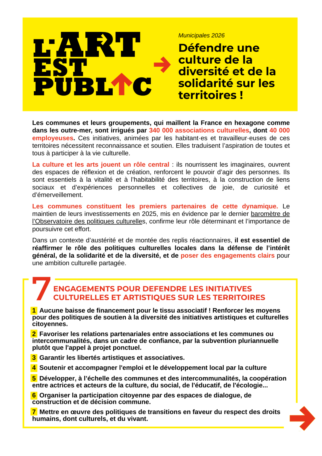 La campagne L'ART EST PUBLIC, articulée autour de 7 engagements, propose un kit de mobilisation, pour outiller les actrices et acteurs culturels et toutes celles et ceux qui souhaitent défendre les arts et la culture au plus près des territoires.