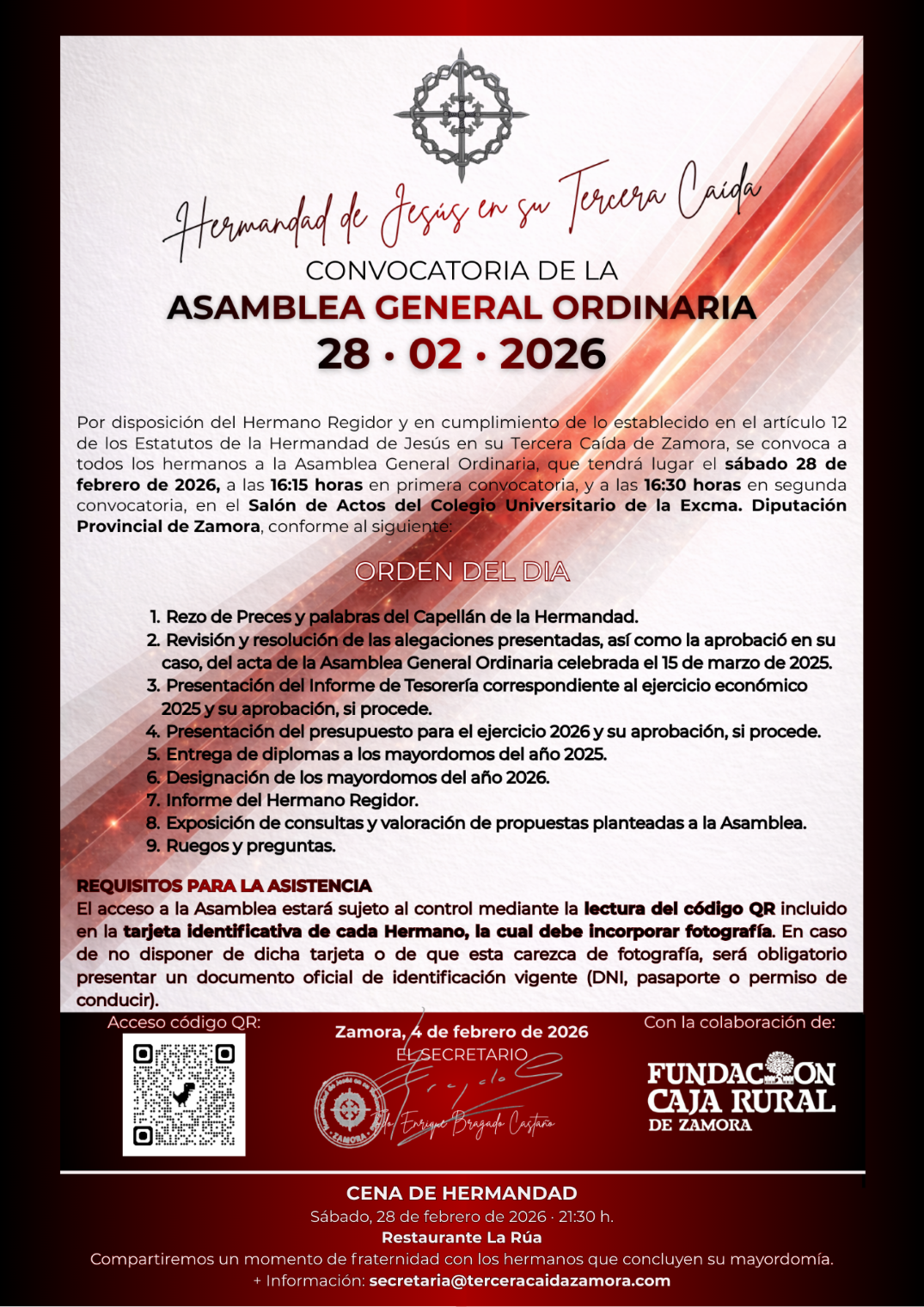Se informa a todos los hermanos y hermanas de que el acta de la Asamblea General Ordinaria, celebrada el 15 de marzo de 2025, se encuentra disponible para su consulta a través del acceso habilitado en la página web de la Hermandad, así como mediante la entrega de una copia en la Casa de Hermandad.