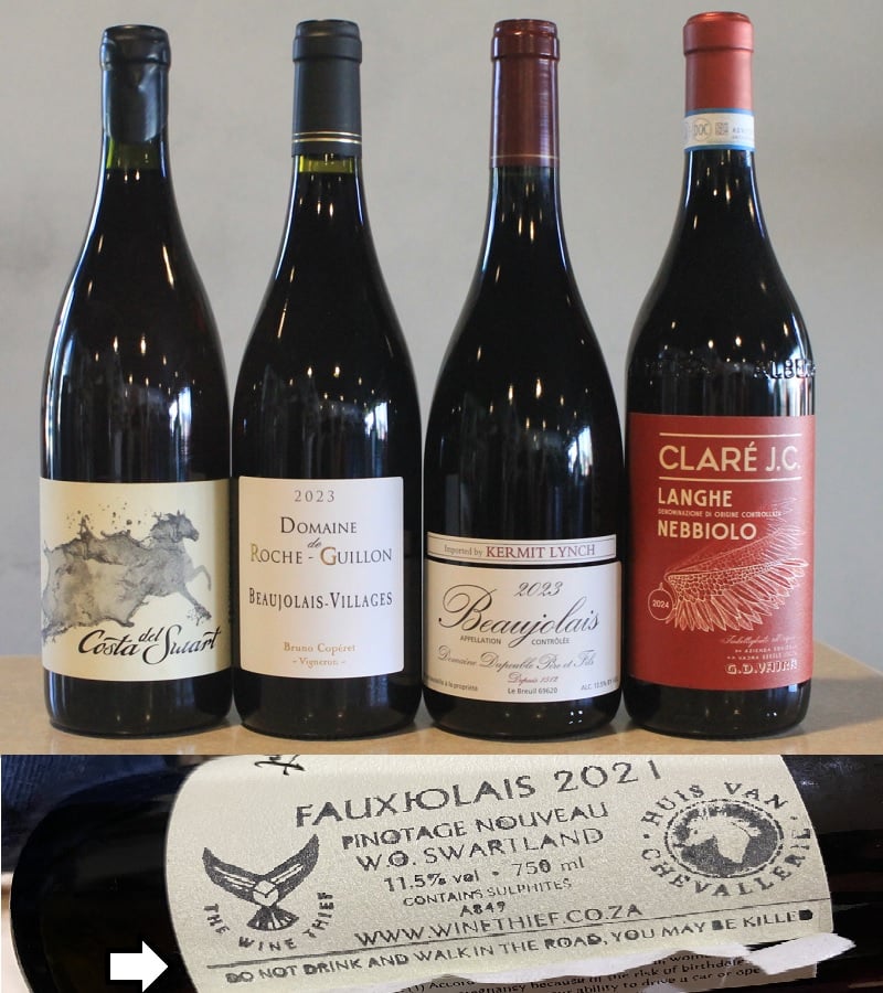 Costa del Swart "Fauxjolais" has a special hidden message when you peel back the label. This one is also in our current wine sixpack