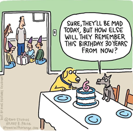 Why do we remember what we remember and forget other experiences and thoughts? I’m not sure of the answer to that, but when I saw this cartoon it reminded of one truth of memories: we’ll never forget when the “dogs ate our 6th birthday party birthday cake.”
