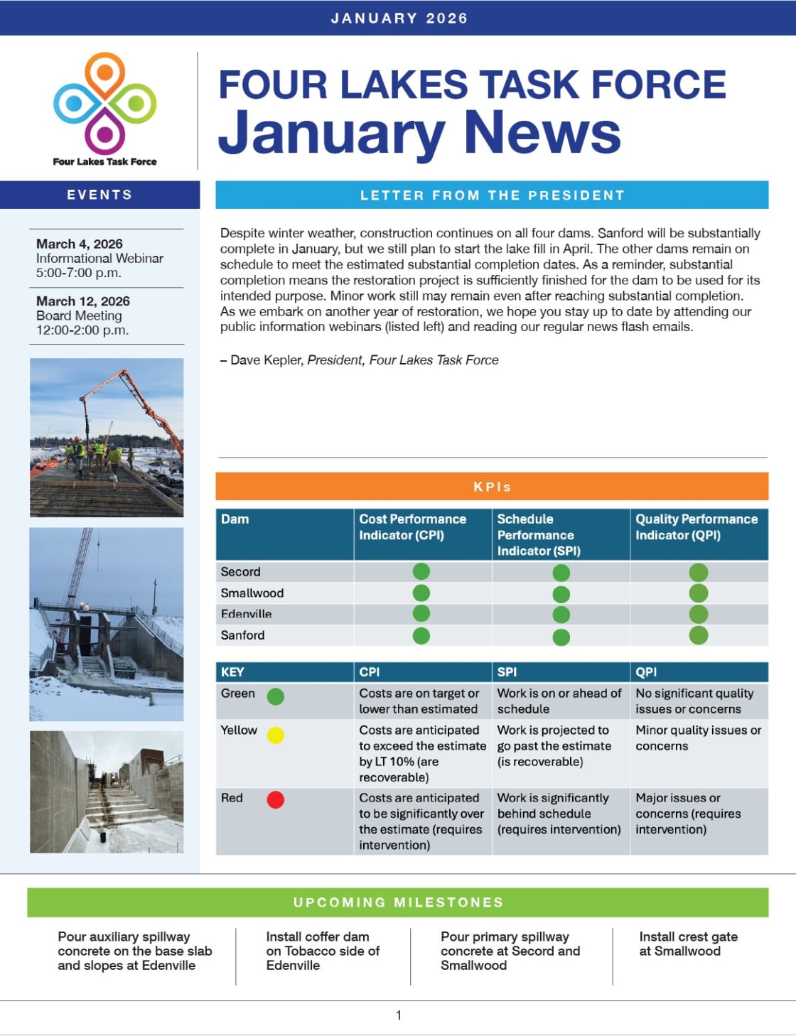 An early winter with less-than-ideal conditions hasn't stopped crews from continuing to work. Sanford will be substantially complete this month and we look forward to lake refill in April. Read more about the work on all four dams in the newsletter. Each dam is seeing significant progress and is on pace for the substantial completion dates.