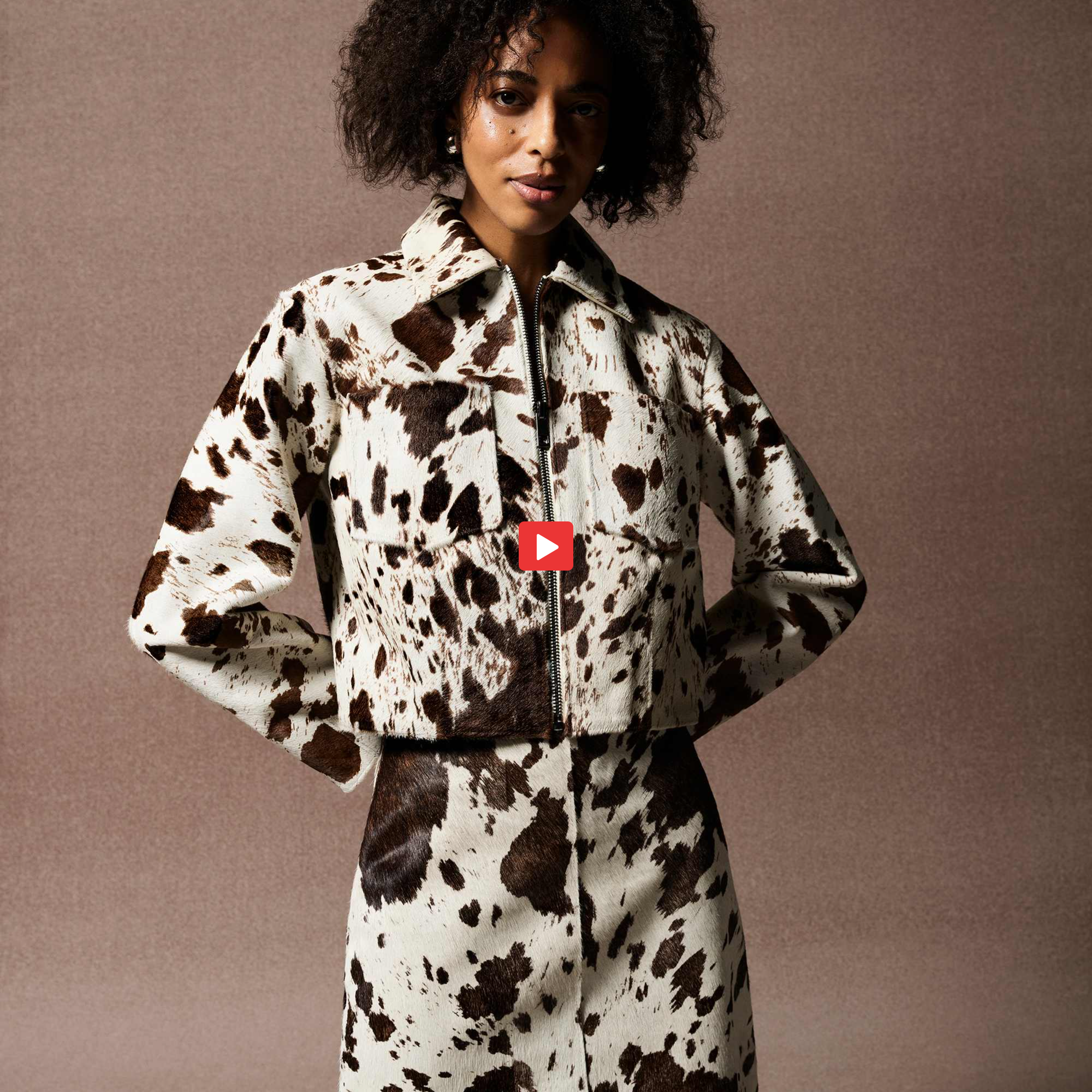 At the centre of the collection is the cow print featured in an a-line skirt and zip jacket, cut to a cropped fit from textured, hair-on leather. Continuing the contemporary take on animal prints, a brushed alpaca tank is detailed with an abstract zebra pattern in rich tones of green.