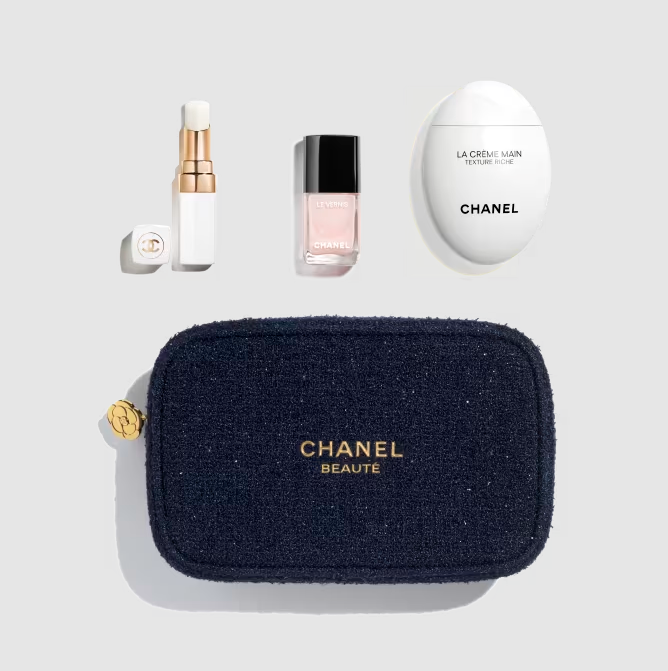 It is woven from shiny black and midnight blue threads and elevated by golden detailing, including a zipper pull in the shape of a camellia, a Chanel symbol. The perfect trio for a polished manicure, as well as hands and lips that stay moisturized throughout the day.