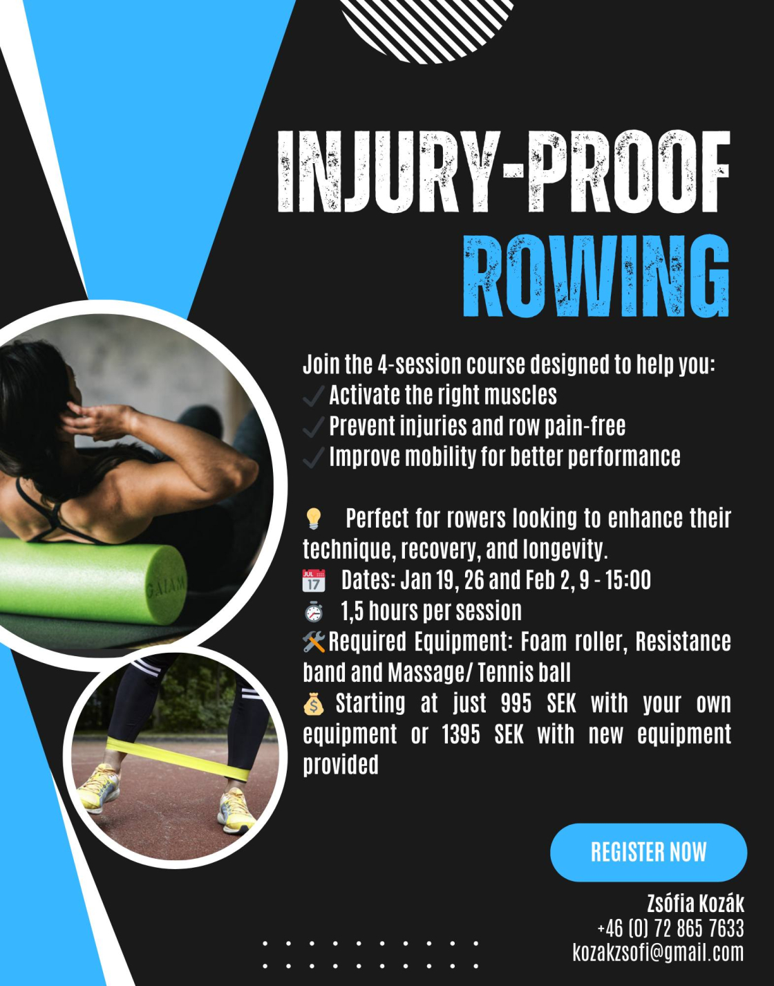 Whether you’re starting to compete or just looking to improve with the training, this course gives you with the tools to row smarter, safer, and stronger. Enhance your performance, prevent injuries, and recover like a pro! Spots are limited, so don’t wait! Secure your place today and get ready to row your best. Sign up or ask questions by reaching out to me directly! (+46 (0) 72-865 7633 or kozakzsofi@gmail.com)