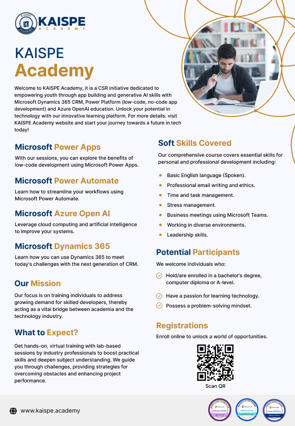 KAISPE Academy is a go-to hub for anyone looking to upskill in the era of automation and AI built to bridge the growing skills gap in Pakistan’s IT sector. At KAISPE Academy we offer expert-led tutorials and workshops in CRM, low-code, and GenAI to help students and professionals gain real-world, job-ready skills. Having hosted events like “App in a Day” and “RPA in a Day,” the academy is committed to shaping a more capable, employable digital workforce.
