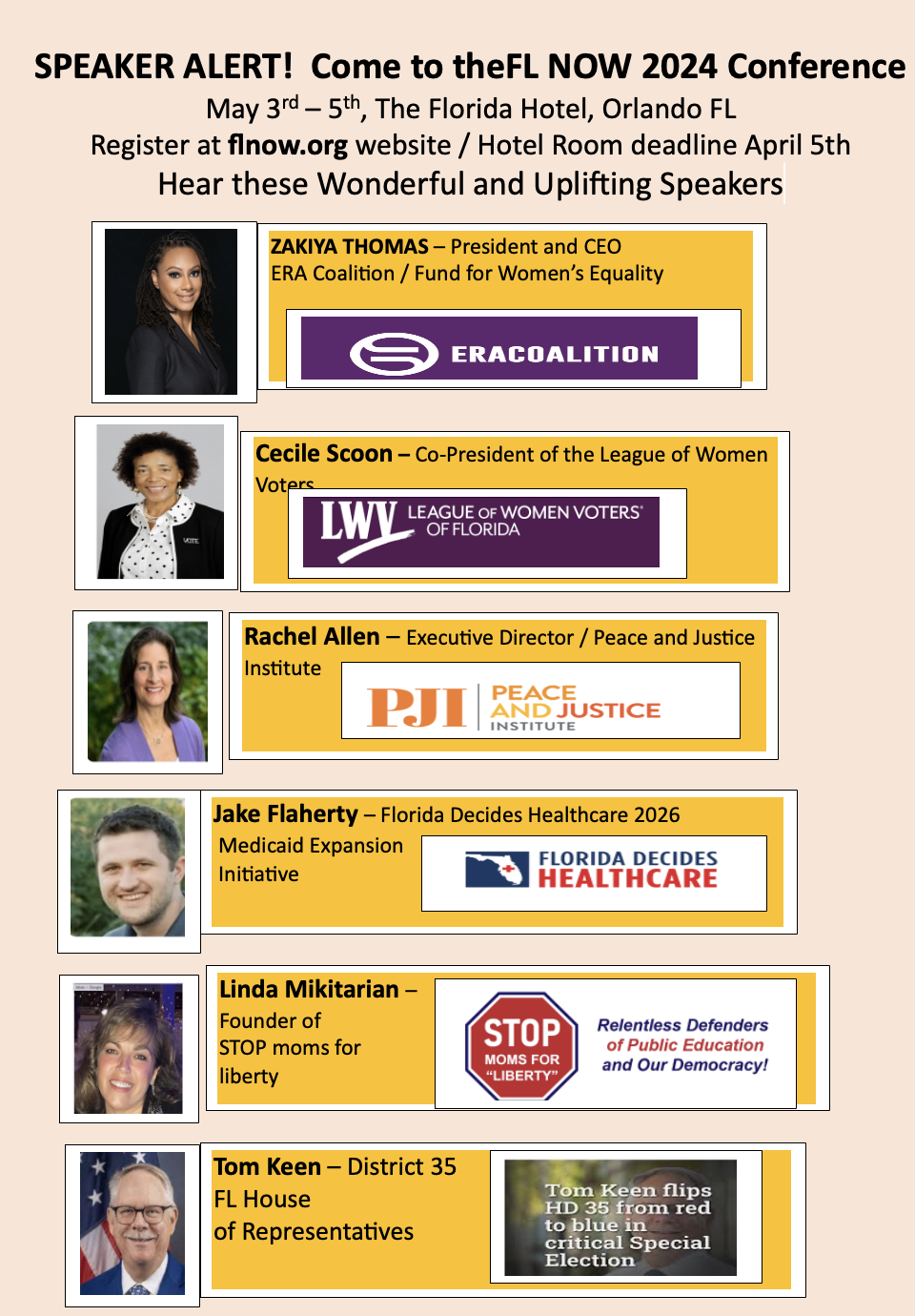 We have FL NOW business to update you on. We will have an action at this conference that we’ll do over the three days. Judi has done a wonderful job on this Conference. There are more details later in this email, e.g., information on each speaker.