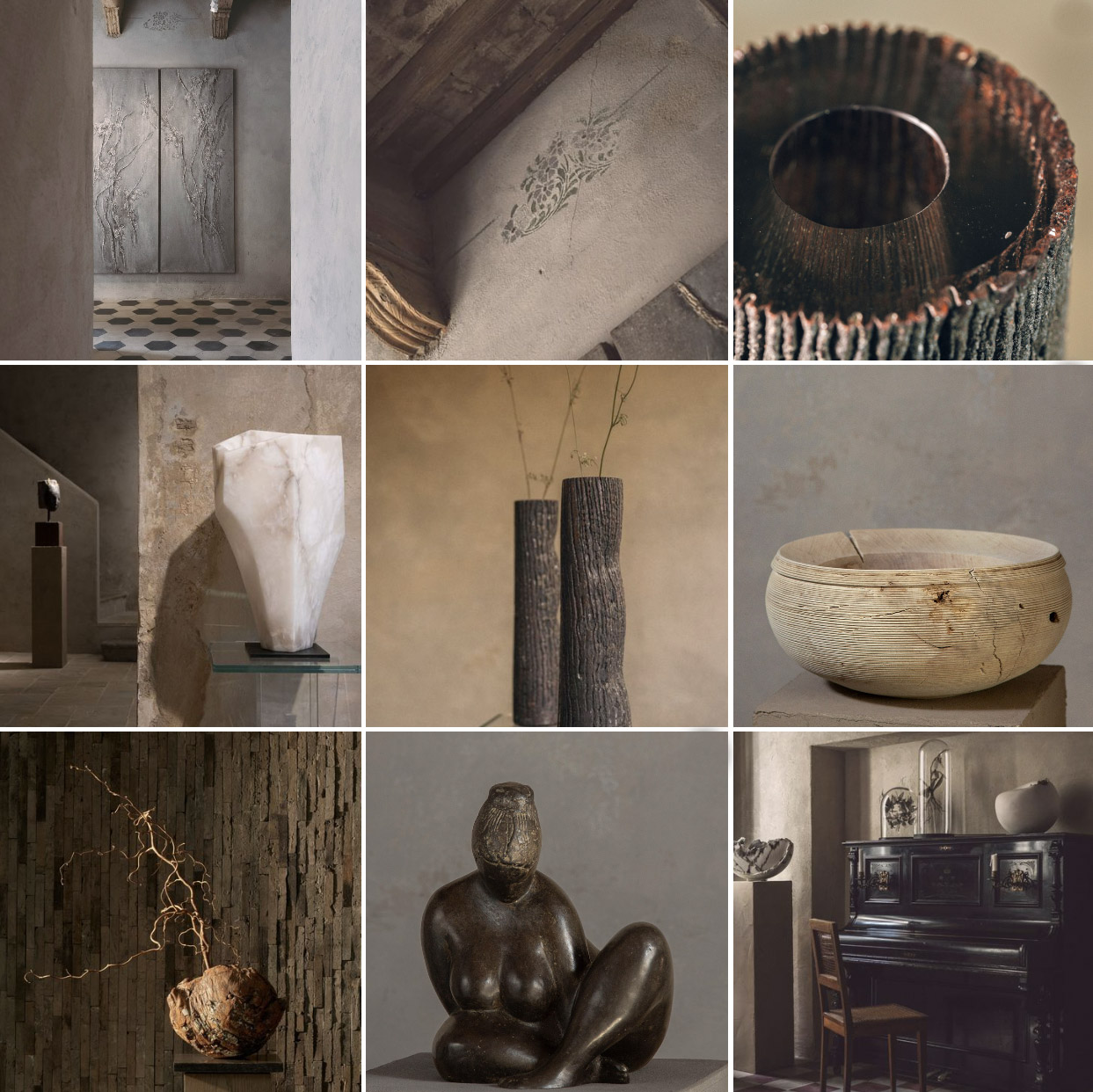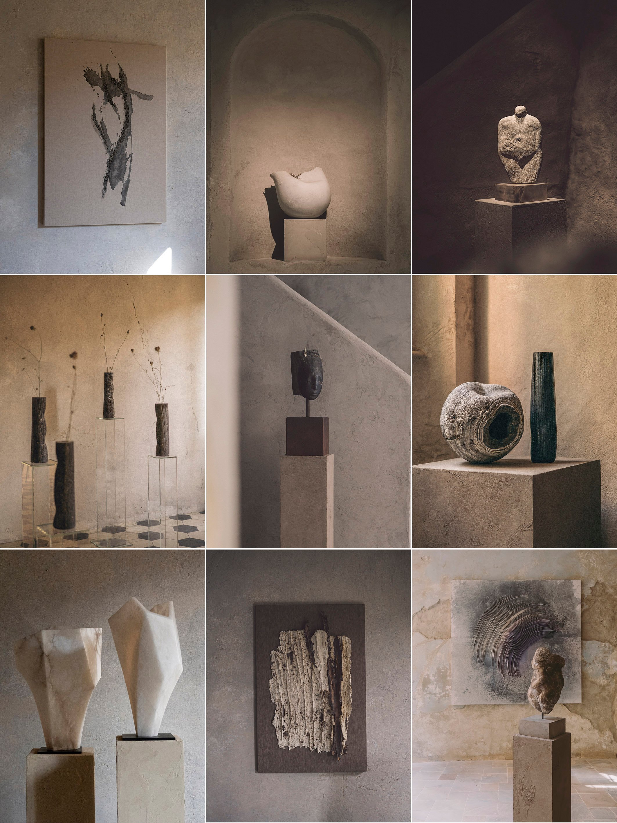 In our historical and fascinating rooms, the language of the interior architecture establishes a stimulating synergy with the selected art, spanning wall and sculptural artworks made in a variety of materials, among them: alabaster, marble, bronze, clay, and raw earth, wood, Venetian glass, oil, acrylic, and mixed media. Addressing ideas of intimacy, balance, and finesse, as well as an intuitive dialogue between finito and non-finito, our artists’ research begins with the observation of Nature to be translated into different forms, nuances, and media.